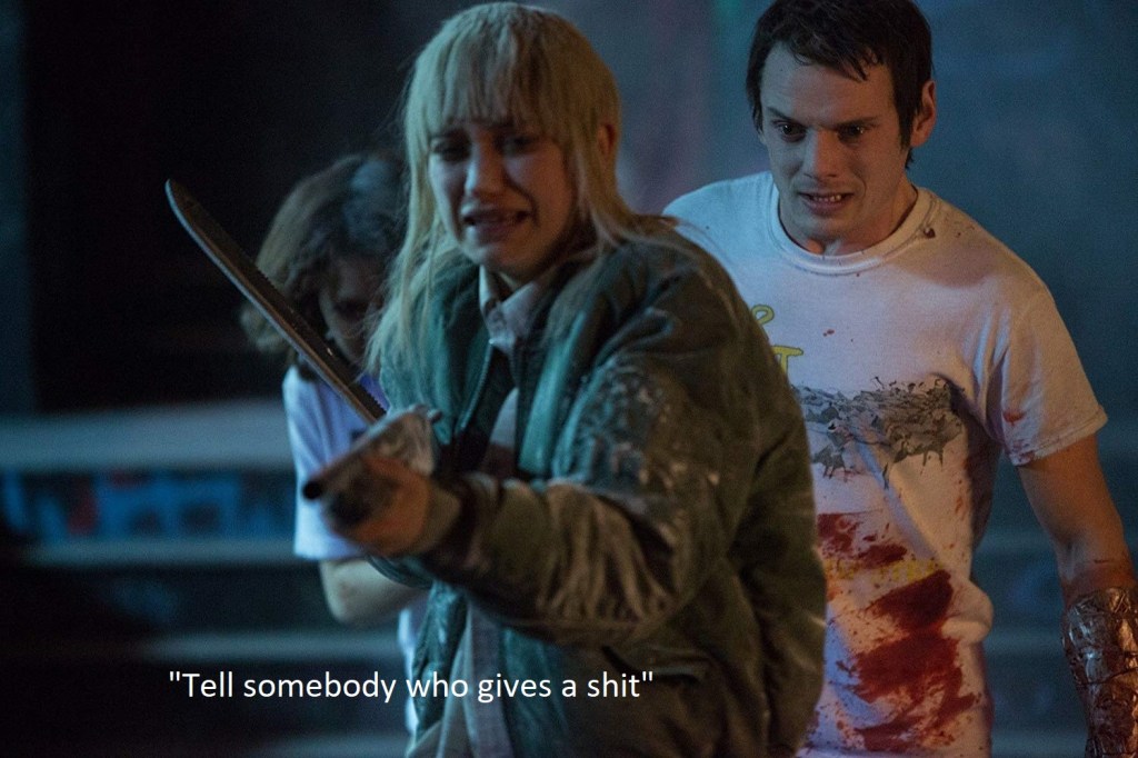 Now a new set of D-bags are sent to finish off the remaining threesome. This time Tad’s Cousin Daniel (Webber) and a lackey are sent in. Daniel has been told they were the ones that murdered Amber’s scene girlfriend Emily. Amber tells Daniel to stop being such a jamoke and that it was Werm that killed Emily. Turns out Cousin Daniel and Emily had a thing, that’s why Werm killed her and suddenly our threesome is a foursome, Cousin Daniel has joined the good guys! Wow what a relief, surely he has insight on how they can escape and likely knows where some guns are. YES, he does he’s got a shotty and- Oh shit they shot Daniel in the face. First Lol moment for me as it’s quite jarring to see half of Daniel’s face disappear. It was the rat bastard bartender! They give him a nice machete to the arm and neck and our bodies are starting to pile up. Now a threesome again, they have a shotty and attempt to escape but run right into an ambush, I mean why choose what appears to be the front door guys? *SIGH* I guess it wouldn’t be horror without some dubious decision making. Sam is able to get a shot off, wounding the poor doggo (It’s incredibly rare that I’d agree with shooting at the pooch, but I’m going to go ahead and side with Sam on this one after seeing him feast on Tiger’s larynx). The doggo, being a tremendous competitor himself barely flinches and poor, lovable Sam meets the same fate as Tiger. Amber takes a bullet in the leg and now it’s just the twosome retreating back to the green room. The final two, Amber and Pat, Poots and Yelchin. Sounds like a yacht rock band.